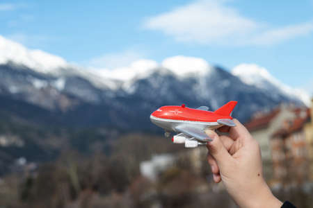 hand with toy airplane on sky background, concept of air travel