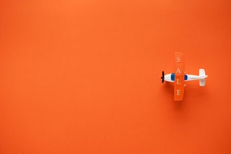 Miniature airplane with the inscription sale on orange background and space for text