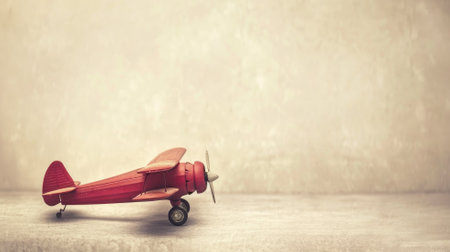 Vintage red toy airplane on concrete floor with beige background