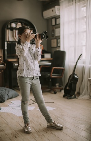 Cute brunette little girl holding an photo camera in the room