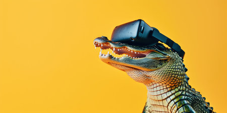 crocodile with virtual reality goggles on a yellow background.