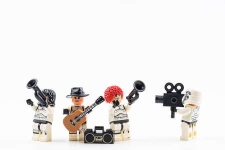 Bangkok, Thailand - April, 16, 2020 : Lego star wars stormtrooper Musicians playing music isolated on white background.