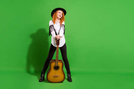 Full length body size view of attractive cheerful talented girl holding guitar having fun isolated over bright green color background