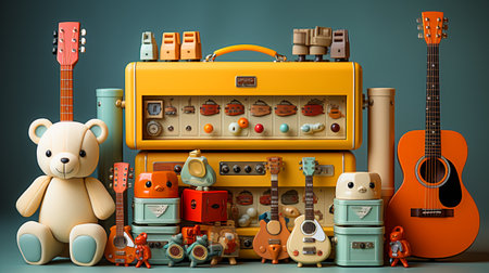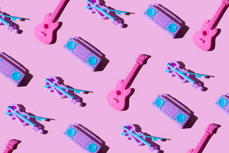 Kid toy guitar, cassette deck player and violin on trendy pastel pink background. Top view, flat lay layout. Minimal music and party concept.