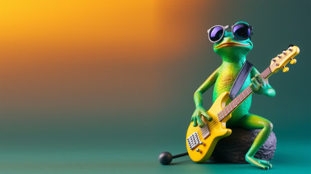 portrait of frog playing guitar and wearing glasses, green and orange gradient background. with copy space, happy and cheerful concept, ideal for banners or greeting cards etc. generative ai