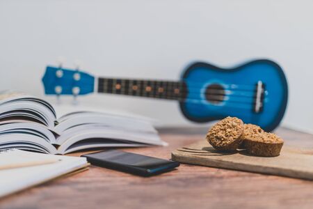 Image of practicing by looking at a smartphone. Smartphone and toy guitar