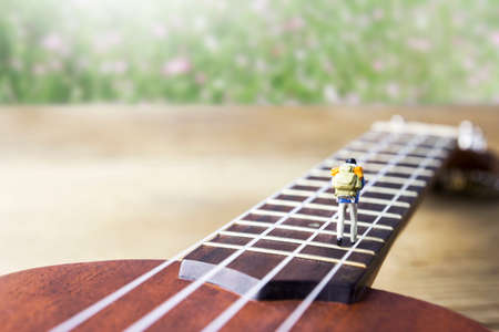 Music and travel concept of miniature backpacker walking on ukulele