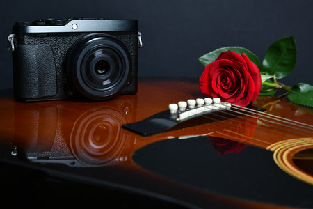 camera and red rose on brown guitar and black background