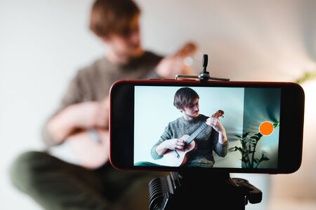 Man dressed in a sweater takes off the vlog of a game on a ukulele at home on the phone.