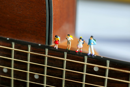 Miniature people : children and student with acoustic guitar,time of relax or music relax,stationary,education concept.