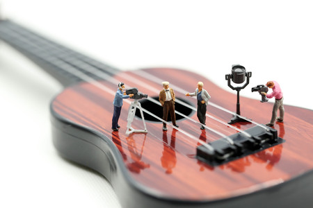 Miniature people : Director, staff and actors on the set of the video singer with guitar,production music concept.