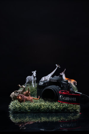 Montréal, Québec, Canada - FEBRUARY 4, 2015 : Canon Camera surrounded by wildlife figurines on dark background. Lion, Elephant, Zebra, Giraffe, Safari.