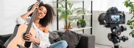 panoramic shot of happy african american girl in braces holding acoustic guitar and looking at digital camera