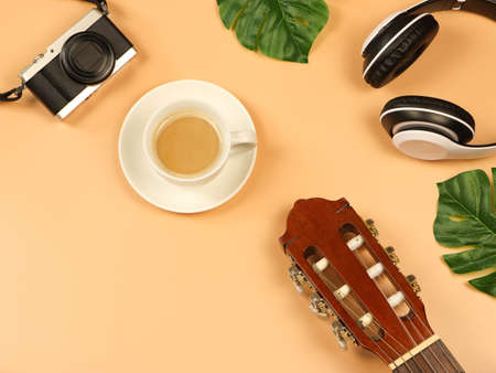 Top view or flat lay of coffee cup , camera ,acoustic guitar and headphones on orange background decored with monstera leaves, copy space. Hobby , music and sound concept.