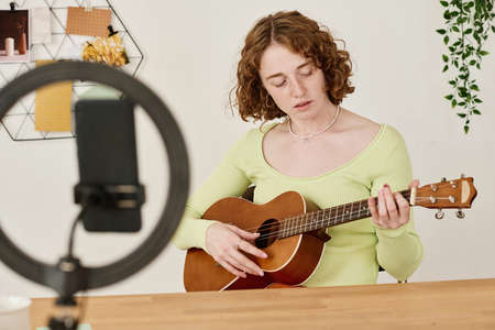 Young female student or teacher of course of guitar playing sitting by desk in front of smartphone camera during online lesson