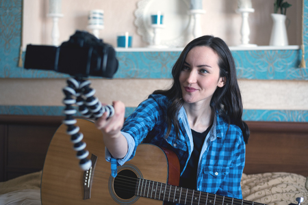 Musician with acoustic guitar on the bed records herself on DSLR camera keeping it in front of her on a tripod