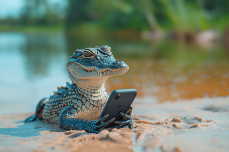 Meme with little alligator uses a waterproof smartphone at the river, surrounded by river and jungles. The image conveys a whimsical, surreal atmosphere, ideal for articles on unusual tech scenarios.