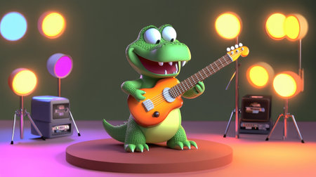 A cartoon 3D crocodile playing a guitar on stage, with colorful lights and a cheering audience, capturing the lively atmosphere of a music concert.