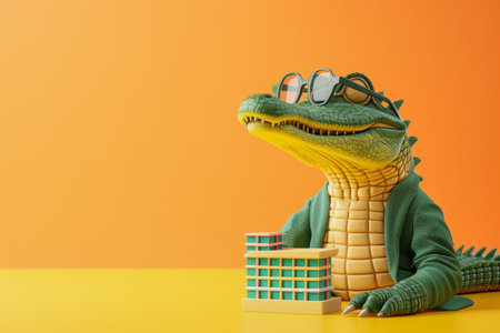 A cartoon crocodile wearing glasses and a suit holding a building. The image has a playful and whimsical mood