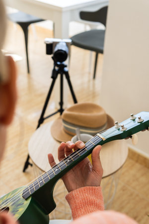 An unrecognizable woman recording herself while playing on a green ukulele in a modern studio