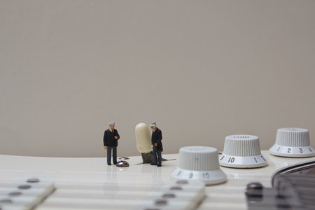 a Miniature worker Standing On A Camera for checking