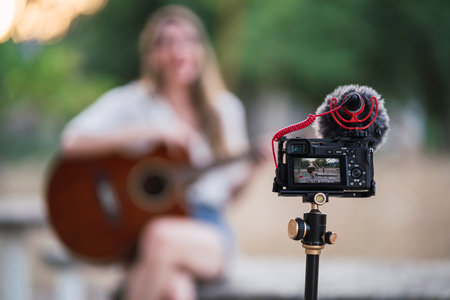 blurred background artist live stream music radio on social media,selective focus at a camera.