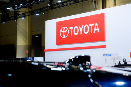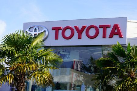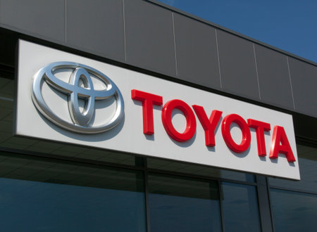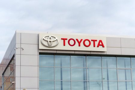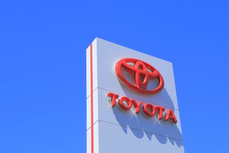 Toyota logo on car dealership building at sunny day - Toyota Motor Corporation is a Japanese automotive manufacturer.