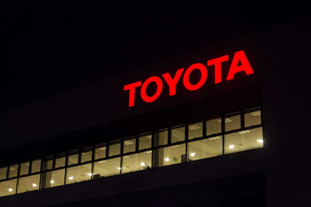 PRAGUE, CZECH REPUBLIC - APRIL 3 2020: Toyota motor company logo on dealership building at night on April 3, 2020 in Prague, Czech Republic.