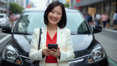 A smiling Asian woman in a white blazer and red shirt holds a smartphone in a busy urban street