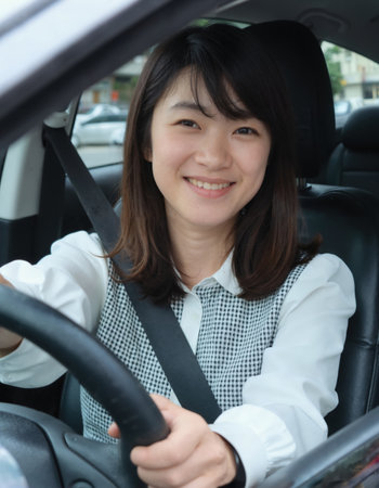 A smiling Asian woman with shoulder-length brown hair drives a car, wearing a white shirt