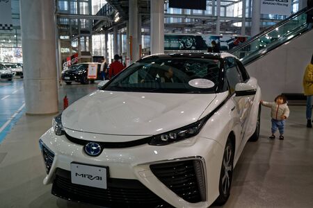 Odaiba, Tokyo, Japan, Toyota Showcase Mega Web Palette Town - January 2; 2020: Rear view of Toyota Mirai Fuel Cell Vehicle.