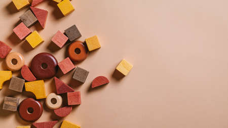 Kids toys. Wooden cubes and rings on a beige background. Flat lay, top view, copy space.