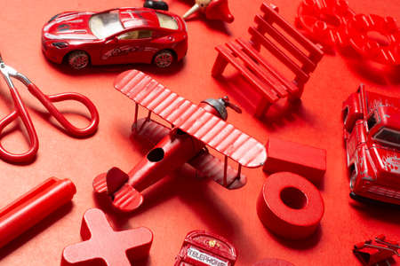 Children toys, wooden blocks, teddy and abacus, creative preschool kids play. Red color background, top view.
