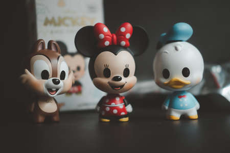 Samut Prakan , Thailand - April 25, 2021 : Figurine donald duc, chip (Tic) and Minnie Mouse, Mickey mouse family figures mystery box blind box from Miniso sell in Thailand