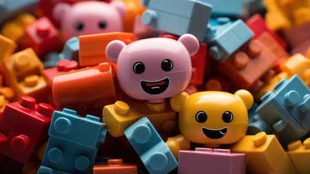 Bunch of colorful plastic toy blocks as background, closeup view
