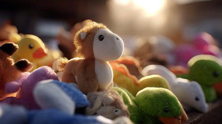 A vibrant assortment of plush toy animals with a focal horse, capturing the essence of playfulness. Ideal for children's products or cheerful decor.