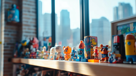 Explore vibrant toys lined up by a window showcasing a playful city backdrop.