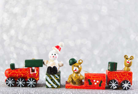 christmas bauble, wooden toy on silver blurred glitter background with copy space