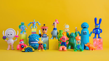 A lively assortment of retro style toys and figurines in vivid colors arranged on a bright yellow background, ideal for creative and playful visuals.