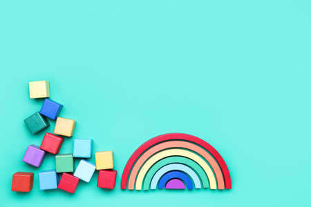 Wooden cubes with blocks on color background