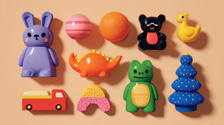 Bright and colorful collection of playful childrens toys arranged together in a vibrant display