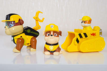 Minsk, Belarus - January 9, 2022: Paw patrol team. Different miniatures of hero Rubble with yellow bulldozer.