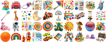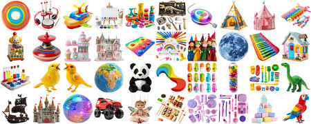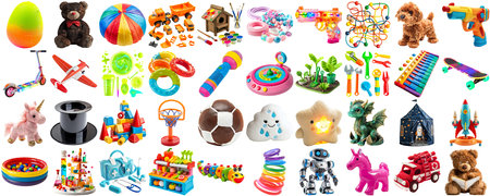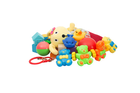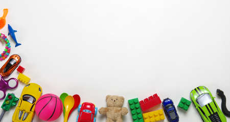 Many colorful Kids toys frame on white background. Top view. Flat lay. Copy space for text