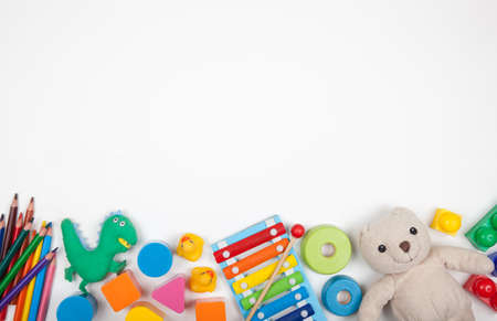 Baby kids toys frame on white background. Teddy bear and many colorful educational wooden, plastic toys. Top view, flat lay