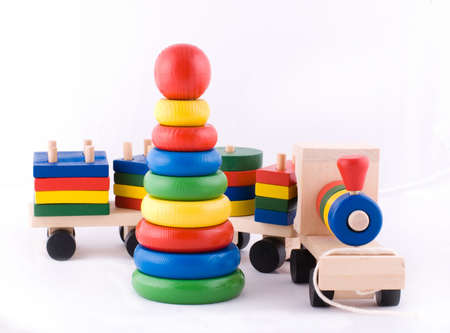 Eco-friendly wooden color constructor isolated on white background. child development to preschool. Playing Building Blocks Toys.