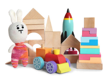 Kids educational developing toys frame on white background. Top view. Flat lay. Copy space for text