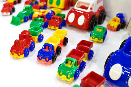 Chongqing, China - August 2019 : Pile of colourful wooden assembly transformer car toys for sale in souvenir shops