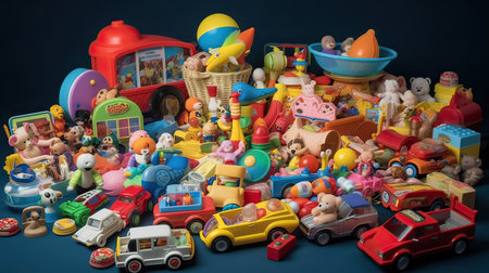 Close up of a box of toys, with many different objects including soft toys, play cars and toddler toys.