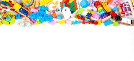 Baby kids toy banner background. Colorful educational toys on white background. Top view, flat lay, copy space for text