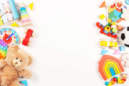 Baby kids toys frame. Colorful educational wooden and fluffy toys for children arranged on white background. Top view, flat lay